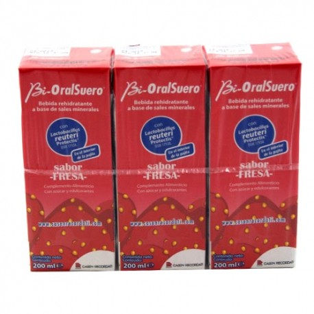 Bi-OralSuero Fresa 3x200ml es una bebida destinada al aporte de líquidos y sales, con edulcorantes y probiótico, recomendado en la prevención y manejo de las deshidrataciones causadas por vómitos o perdidas fecales excesivas.